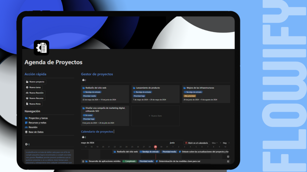 ¡Transforma tu planificación con nuestra plantilla de Notion para la agenda de proyectos! Diseñada para centralizar y optimizar la gestión de proyectos, tareas, recursos, reuniones y notas, esta herramienta es indispensable para mantener tu trabajo organizado y alcanzar tus objetivos con eficiencia.
